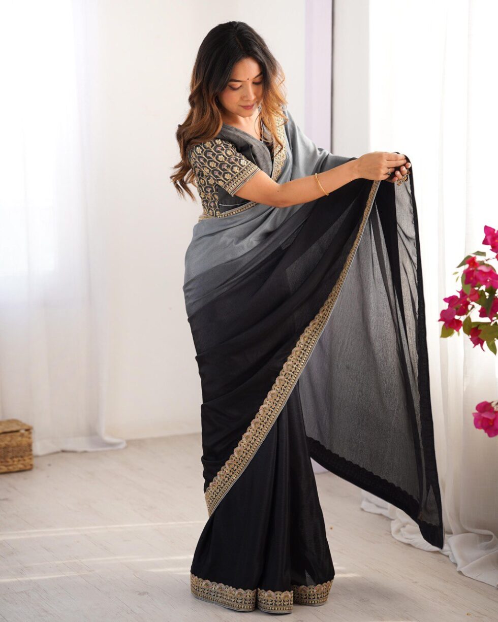 Chinon Silk saree with thread and sequence lace work, 5.5M cut, includes unstitched blouse. Priced at ₹4,399.00.